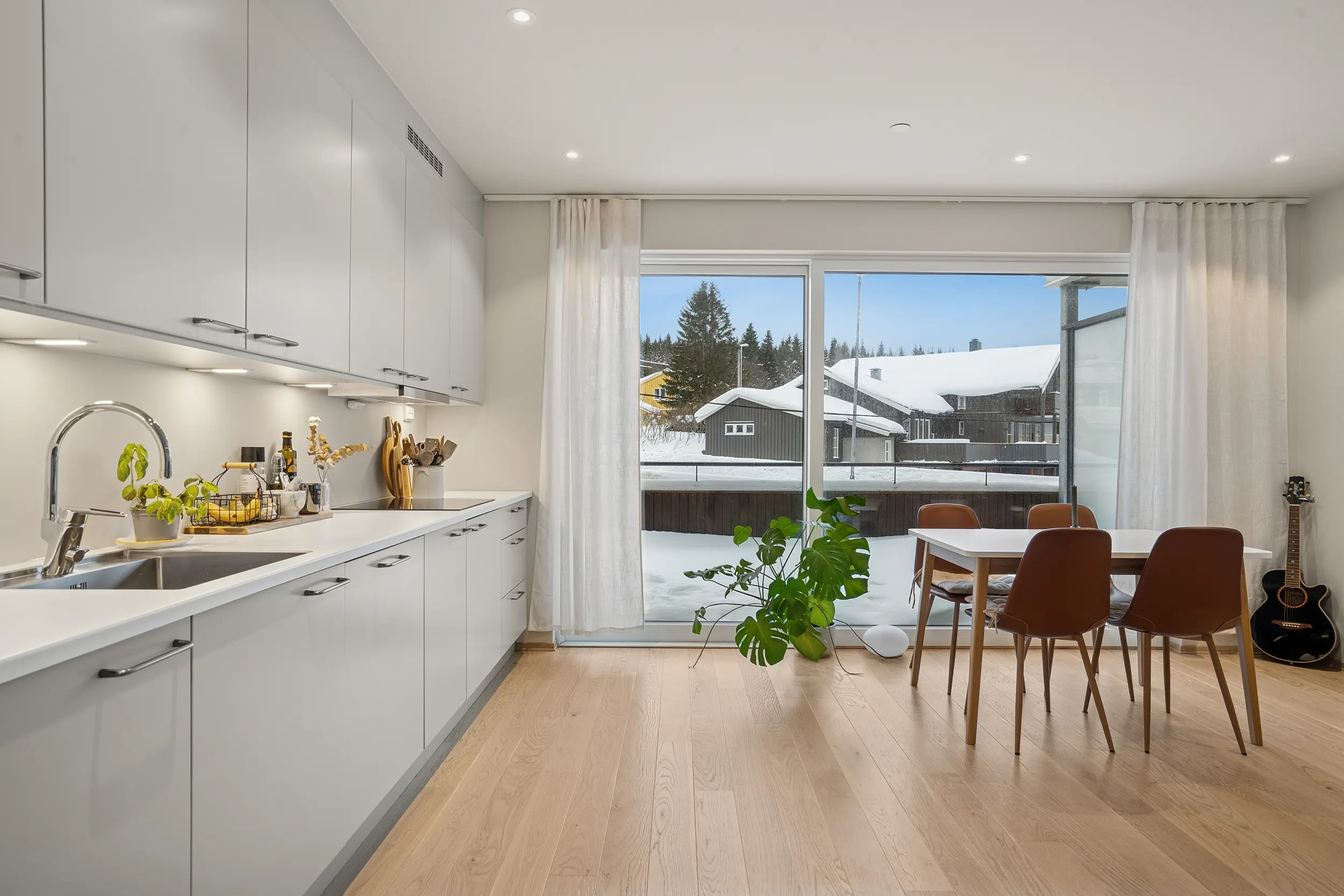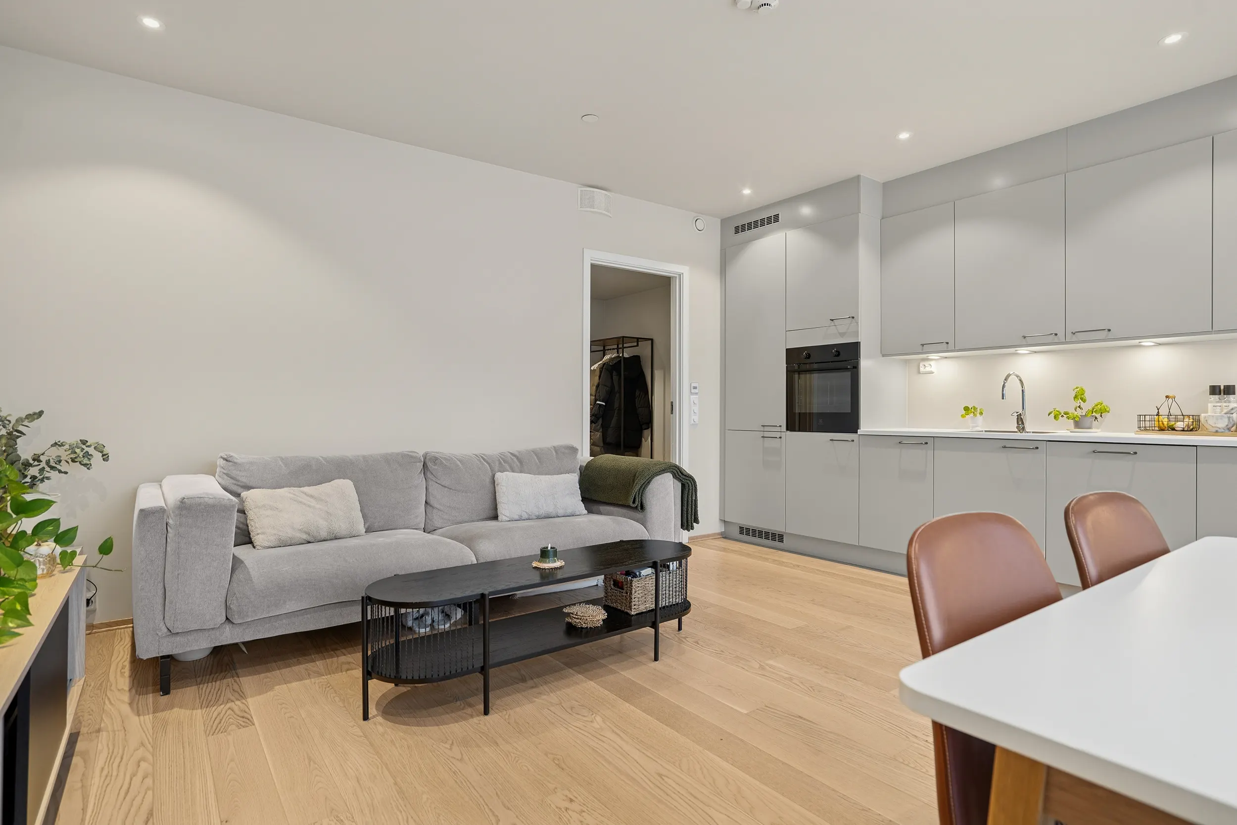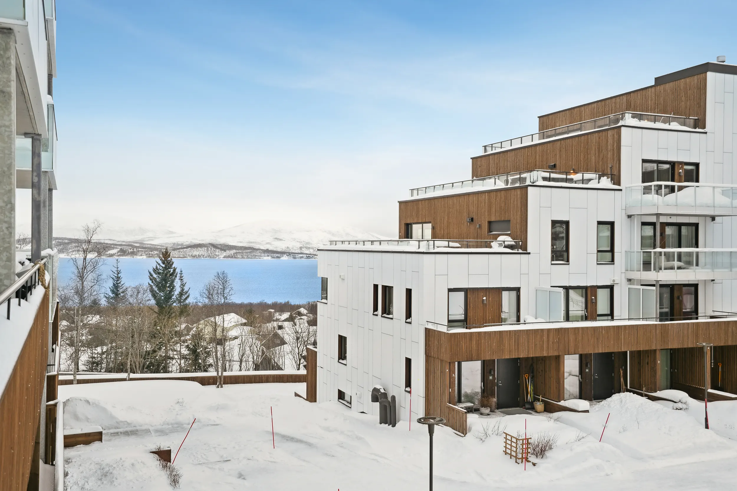Her får du en moderne bolig i andre etasje med gode utearealer, inkludert en sørvendt og en nordvendt balkong. Leiligheten har romslige soverom, bad, walk-in garderobe og en åpen stue- og kjøkkenløsning. Kjøkkenet er levert av Tromsøs egen kjøkkenprodusent, Nova, modell Tromsdalstinden, med stilrent design og god funksjonalitet.